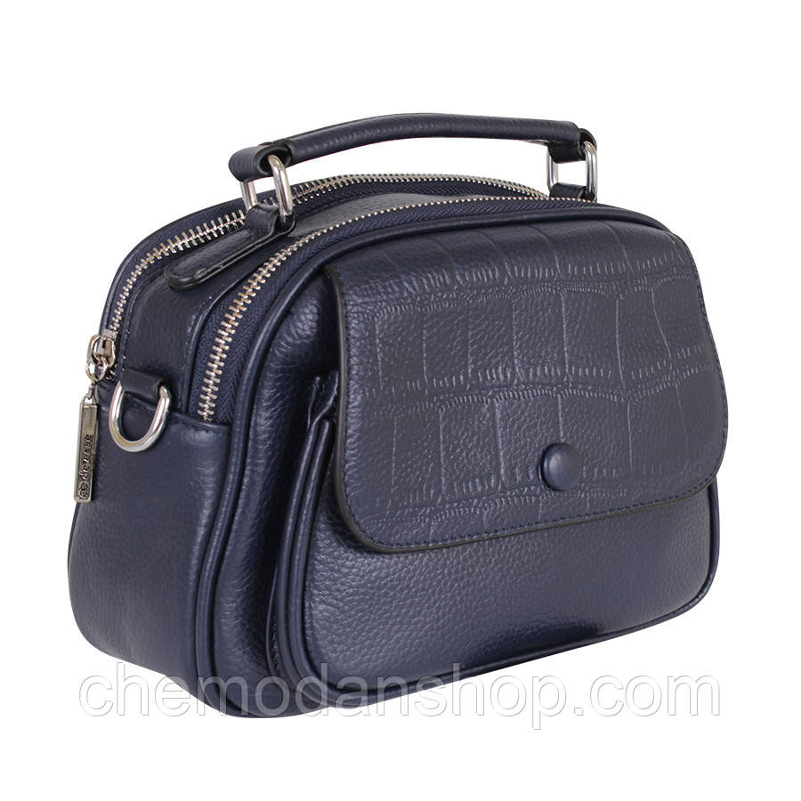 Нова стильна модель шкіряної сумочки DE ESSE. Маленька сумочка виготовлена в незвичайному дизайні. Клапан на лицьовій стороні декорований оздобленням у формі шкіри рептилії. Зверху коротка ручка, а також у доповненні 2 ремені — широкий текстильний і вузький шкіряний. З їхньою допомогою Ви дуже просто можете змінювати свій стиль. У сумці 2 відділення під різними блискавками. Крім зовнішніх переваг і зручності, відзначимо високу якість аксесуарів DE ESSE. Сумочки з натуральної телячої шкіри чудово носяться й довго зберігають свій зовнішній вигляд. Вибирайте свою модель із online-каталолога DE ESSE!