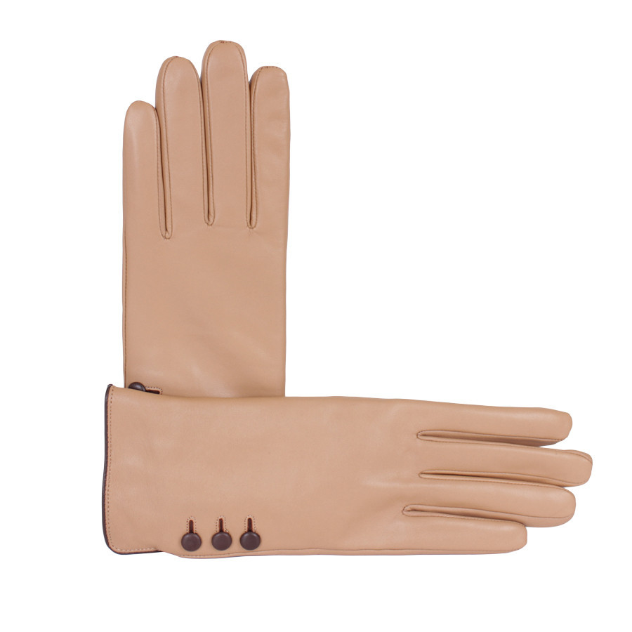 Рукавички з м'якої, приємної на дотик натуральної шкіри. Манжети прикрашені декоративними ґудзиками. Усередині тепла підкладка з натуральної вовни. Теплий колір рукавичок універсальний і підійде до будь-якого забарвлення верхнього одягу.