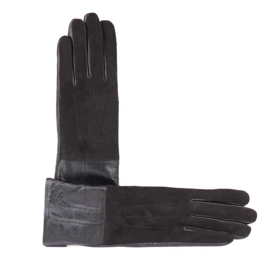 Подовжена модель рукавичок із комбінованих матеріалів — замші та натуральної шкіри. Підкладка з вовни зігріє Вас навіть у найсильніший мороз.