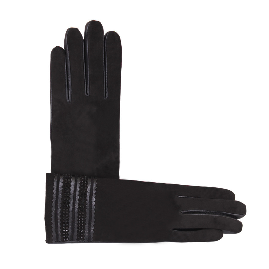 Теплі рукавички з вовняною підкладкою. Манжети прикрашені стразами чорного кольору. Тильна сторона виготовлена з м'якої замші, внутрішня сторона для практичності — з натуральної шкіри.