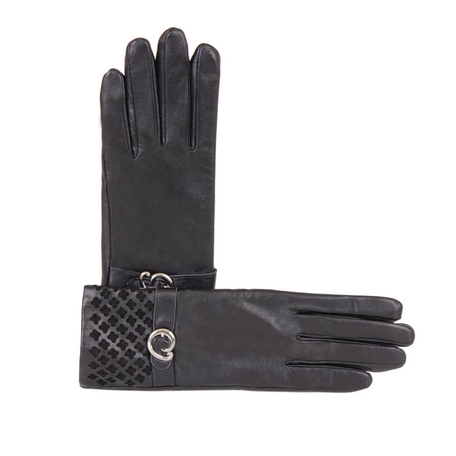 Рукавички з м'якої натуральної шкіри. Теплі завдяки підкладці з натуральної вовни. Манжені прикрашені декоративним ремінцем і натуральною замшею.