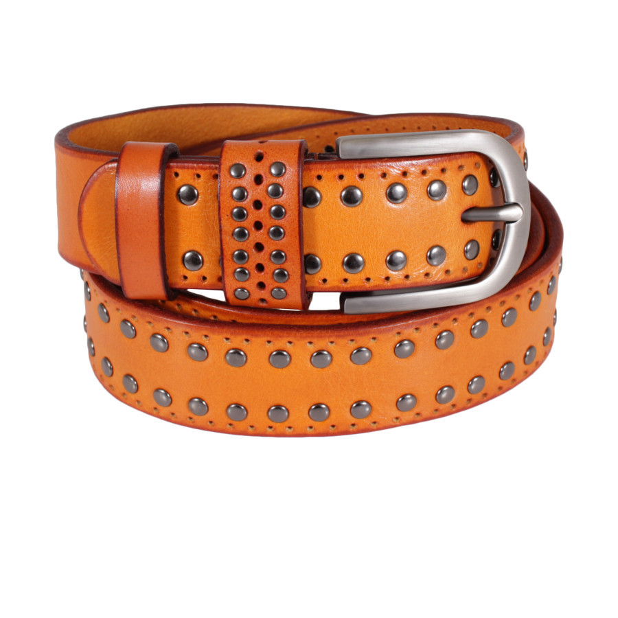Стильний шкіряний ремінь із класичною пряжкою з матового металу. Полотно прикрашене металевими заклепками.